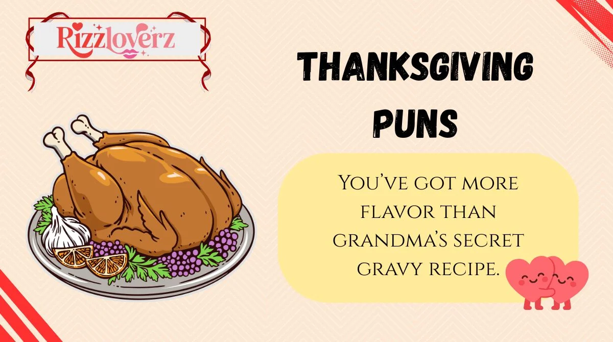 And there you have itâ231+ Thanksgiving puns that serve laughs, love, and irresistible rizz!